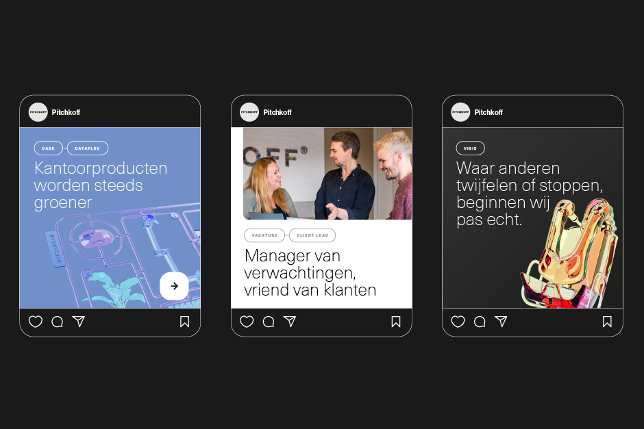 Tijdens een aantal intensieve workshops bleek dat het team zich niet langer herkende in hun eerdere avontuurlijke insteek. Ze wilden liever hun eigen unieke kijk op de branche gebruiken om een enthousiaste leiderschapsrol te vervullen. Daarom ontwikkelden we een fanatieke merkpositionering, met bijbehorende klantpersona’s als extern geweten, zodat ze concrete handvatten kregen voor hun ambities. Vervolgens namen we hun werkwijze onder de loep en creëerden de Pitchkoff Plottwister: hun methode om het onverwachte mogelijk te maken. Want grensverleggend zijn betekent de comfortzone uitdagen – en elk vraagstuk van een goede twist voorzien.